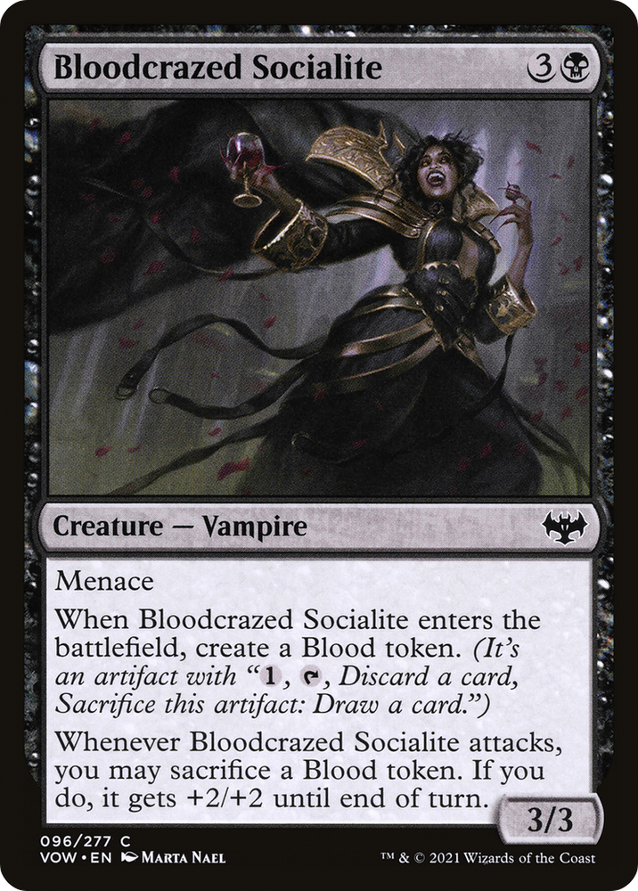 Menace When this creature enters, create a Blood token. (It's an artifact with ", , Discard a card, Sacrifice this token: Draw a card.") Whenever this creature attacks, you may sacrifice a Blood token. If you do, it gets +2/+2 until end of turn.
