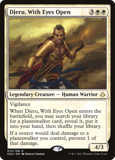 Vigilance When Djeru enters, you may search your library for a planeswalker card, reveal it, put it into your hand, then shuffle. If a source would deal damage to a planeswalker you control, prevent 1 of that damage.