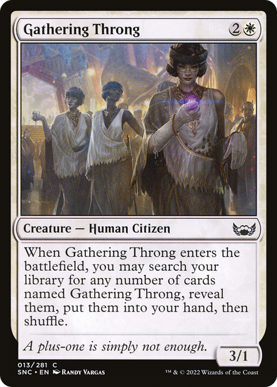 When this creature enters, you may search your library for any number of cards named Gathering Throng, reveal them, put them into your hand, then shuffle.