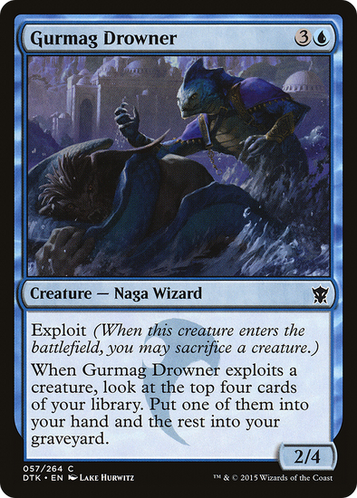 Exploit (When this creature enters, you may sacrifice a creature.) When this creature exploits a creature, look at the top four cards of your library. Put one of them into your hand and the rest into your graveyard.
