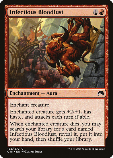 When enchanted creature dies, you may search your library for a card named Infectious Bloodlust, reveal it, put it into your hand, then shuffle.
