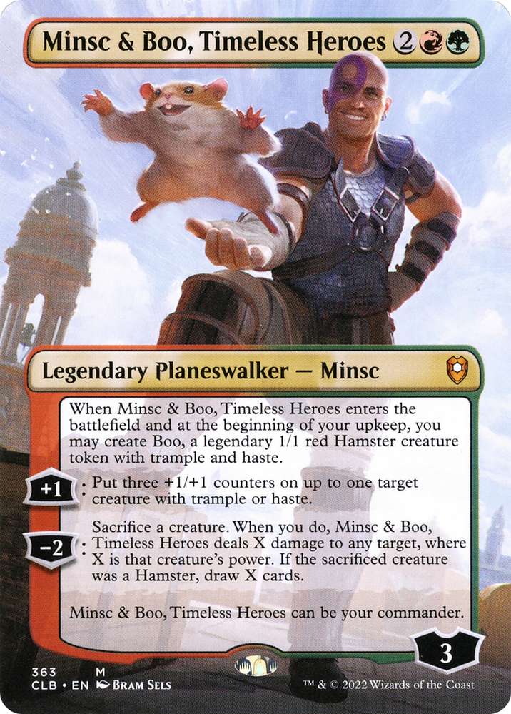When Minsc & Boo enters and at the beginning of your upkeep, you may create Boo, a legendary 1/1 red Hamster creature token with trample and haste. +1: Put three +1/+1 counters on up to one target creature with trample or haste. −2: Sacrifice a creature. When you do, Minsc & Boo deals X damage to any target, where X is that creature's power. If the sacrificed creature was a Hamster, draw X cards. Minsc & Boo, Timeless Heroes can be your commander.