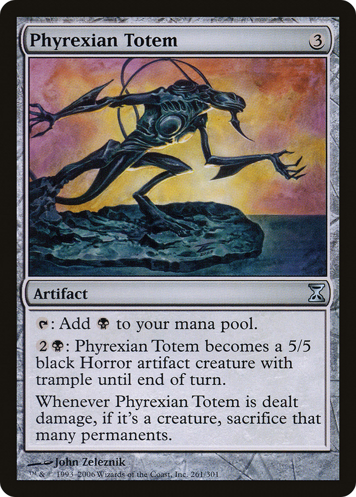 : This artifact becomes a 5/5 black Phyrexian Horror artifact creature with trample until end of turn.