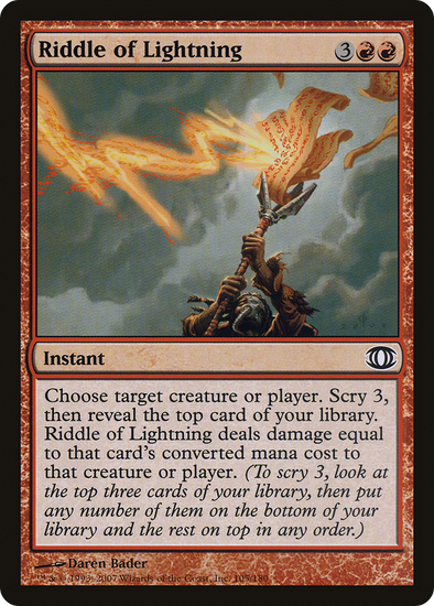 Choose any target. Scry 3, then reveal the top card of your library. Riddle of Lightning deals damage equal to that card's mana value to that permanent or player.