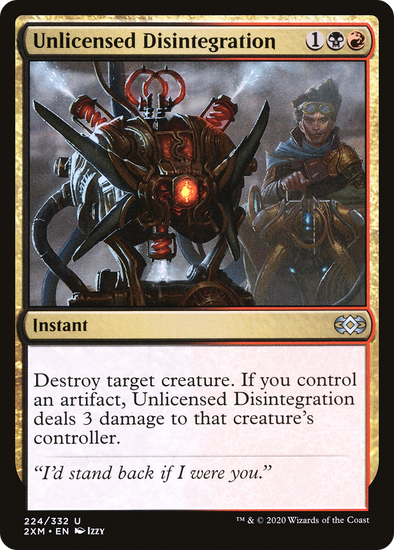 Destroy target creature. If you control an artifact, Unlicensed Disintegration deals 3 damage to that creature's controller.