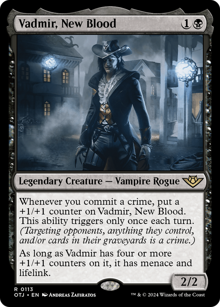 Whenever you commit a crime, put a +1/+1 counter on Vadmir. This ability triggers only once each turn. (Targeting opponents, anything they control, and/or cards in their graveyards is a crime.) As long as Vadmir has four or more +1/+1 counters on it, it has menace and lifelink.