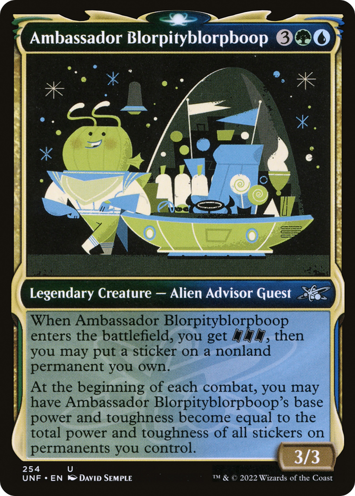When Ambassador Blorpityblorpboop enters, you get {TK}{TK}{TK}, then you may put a sticker on a nonland permanent you own. At the beginning of each combat, you may have Ambassador Blorpityblorpboop's base power become equal to the total power of all stickers on permanents you control and its base toughness become equal to those stickers' total toughness.