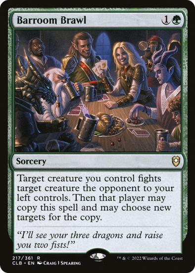 Target creature you control fights target creature the opponent to your left controls. Then that player may copy this spell and may choose new targets for the copy.