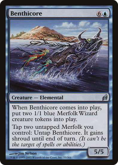 When this creature enters, create two 1/1 blue Merfolk Wizard creature tokens. Tap two untapped Merfolk you control: Untap this creature. It gains shroud until end of turn. (It can't be the target of spells or abilities.)