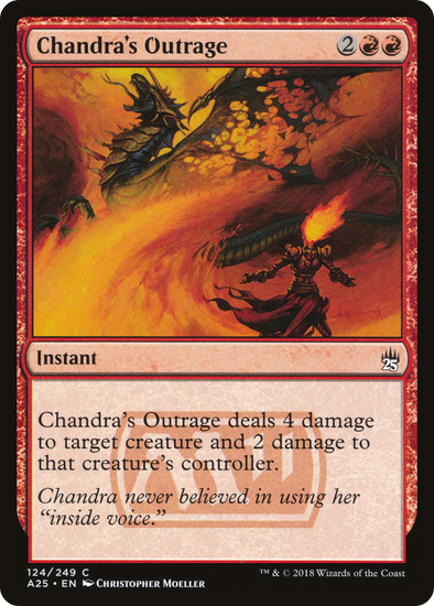 Casting Cost Card TypeInstant RarityCommon ArtistChristopher Moeller Legalities NOT LEGALStandard NOT LEGALFuture LEGALHistoric LEGALTimeless LEGALGladiator LEGALPioneer LEGALModern LEGALLegacy LEGALPauper LEGALVintage LEGALPenny LEGALCommander LEGALOathbreaker NOT LEGALStandardbrawl LEGALBrawl NOT LEGALAlchemy LEGALPauper Commander LEGALDuel NOT LEGALOldschool NOT LEGALPremodern LEGALPredh Chandra's Outrage deals 4...
