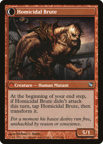 At the beginning of your end step, if Homicidal Brute didn't attack this turn, tap Homicidal Brute, then transform it.