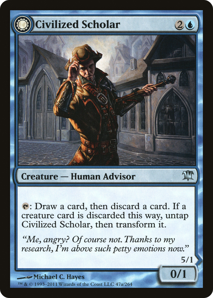 T: Draw a card, then discard a card. If a creature card is discarded this way, untap Civilized Scholar, then transform it.