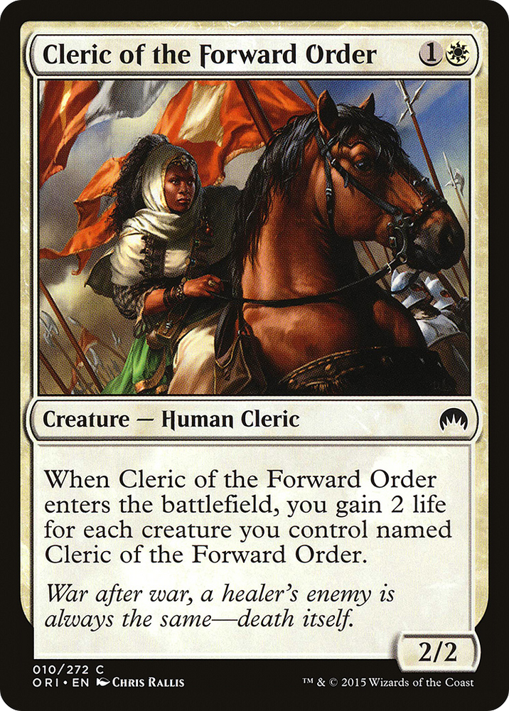 When this creature enters, you gain 2 life for each creature you control named Cleric of the Forward Order.
