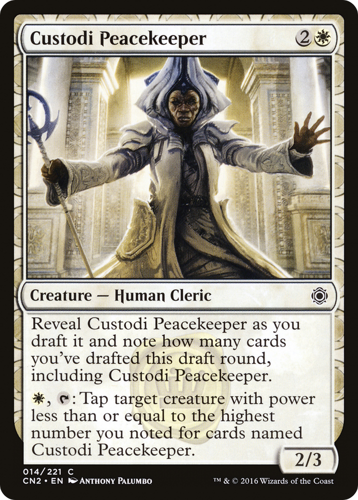 Reveal this card as you draft it and note how many cards you've drafted this draft round, including this card. , : Tap target creature with power less than or equal to the highest number you noted for cards named Custodi Peacekeeper.