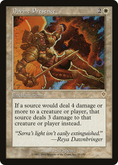 If a source would deal 4 or more damage to a permanent or player, that source deals 3 damage to that permanent or player instead.