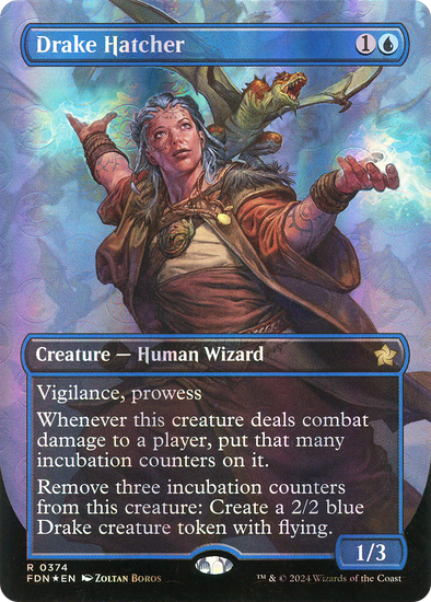 Vigilance, prowess (Whenever you cast a noncreature spell, this creature gets +1/+1 until end of turn.) Whenever this creature deals combat damage to a player, put that many incubation counters on it. Remove three incubation counters from this creature: Create a 2/2 blue Drake creature token with flying.