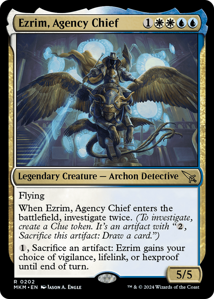 When Ezrim enters, investigate twice. (To investigate, create a Clue token. It's an artifact with ", Sacrifice this token: Draw a card.")
