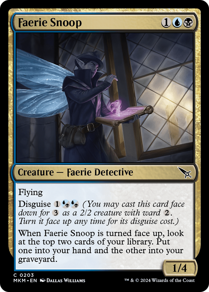 Flying Disguise {U/B}{U/B} (You may cast this card face down for as a 2/2 creature with ward . Turn it face up any time for its disguise cost.) When this creature is turned face up, look at the top two cards of your library. Put one into your hand and the other into your graveyard.