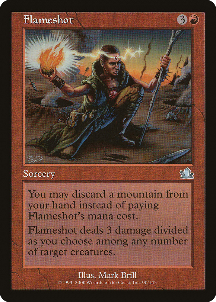 You may discard a Mountain card rather than pay this spell's mana cost. Flameshot deals 3 damage divided as you choose among one, two, or three target creatures.