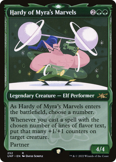 As Hardy of Myra's Marvels enters, choose a number. Whenever you cast a spell with the chosen number of lines of flavor text, put that many +1/+1 counters on target creature. Partner (You can have two commanders if both have partner.)