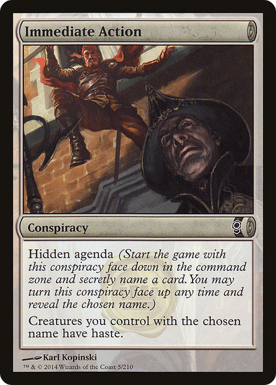 Hidden agenda (Start the game with this conspiracy face down in the command zone and secretly choose a card name. You may turn this conspiracy face up any time and reveal that name.) Creatures you control with the chosen name have haste.