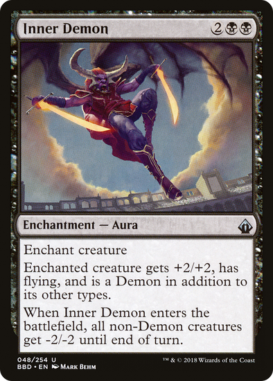 When this Aura enters, all non-Demon creatures get -2/-2 until end of turn.