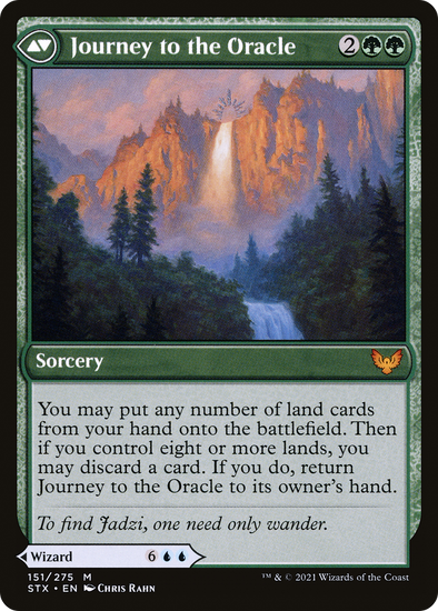 You may put any number of land cards from your hand onto the battlefield. Then if you control eight or more lands, you may discard a card. If you do, return Journey to the Oracle to its owner's hand.