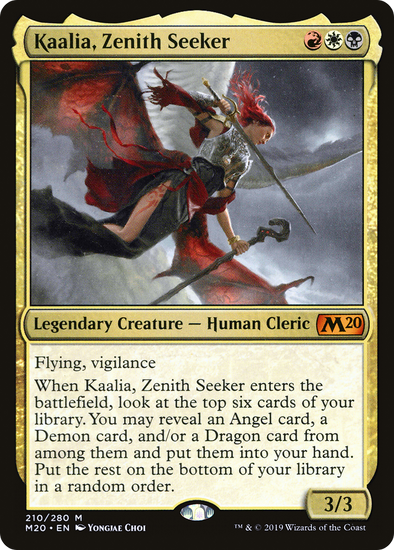 Flying, vigilance When Kaalia enters, look at the top six cards of your library. You may reveal an Angel card, a Demon card, and/or a Dragon card from among them and put them into your hand. Put the rest on the bottom of your library in a random order.