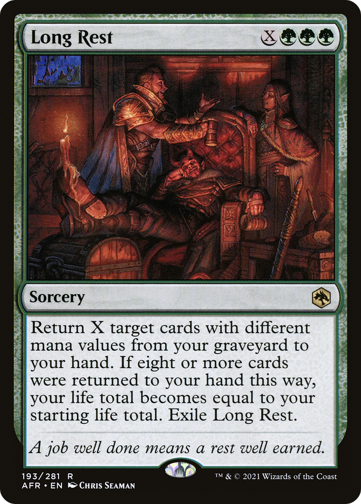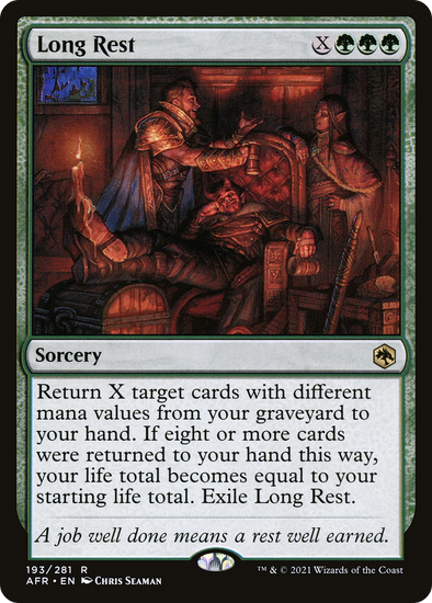 Return X target cards with different mana values from your graveyard to your hand. If eight or more cards were returned to your hand this way, your life total becomes equal to your starting life total. Exile Long Rest.