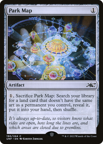 , Sacrifice this artifact: Search your library for a land card that doesn't have the same art as a permanent you control, reveal it, put it into your hand, then shuffle.