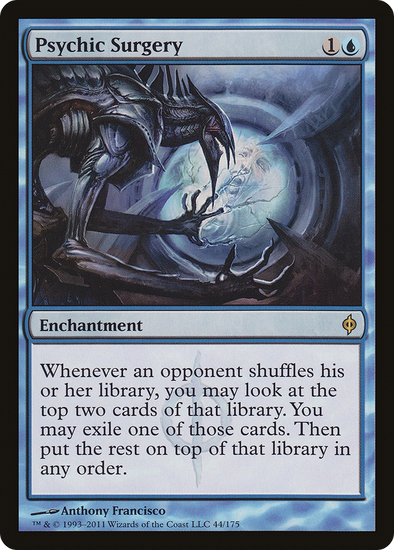 Whenever an opponent shuffles their library, you may look at the top two cards of that library. You may exile one of those cards. Then put the rest on top of that library in any order.