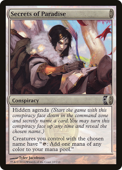 Hidden agenda (Start the game with this conspiracy face down in the command zone and secretly choose a card name. You may turn this conspiracy face up any time and reveal that name.) Creatures you control with the chosen name have ": Add one mana of any color."