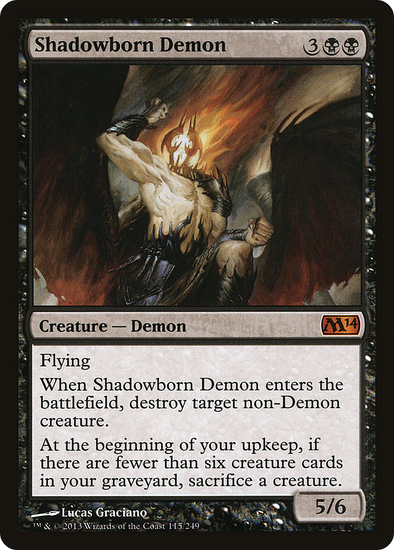 Flying When this creature enters, destroy target non-Demon creature. At the beginning of your upkeep, if there are fewer than six creature cards in your graveyard, sacrifice a creature.