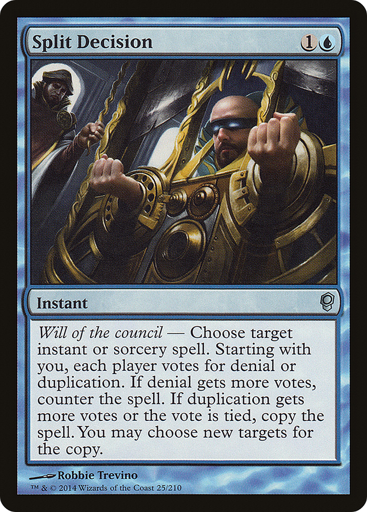 Will of the council — Choose target instant or sorcery spell. Starting with you, each player votes for denial or duplication. If denial gets more votes, counter the spell. If duplication gets more votes or the vote is tied, copy the spell. You may choose new targets for the copy.