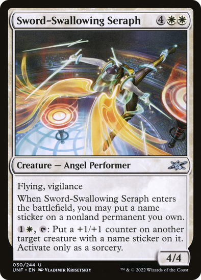 Flying, vigilance When this creature enters, you may put a name sticker on a nonland permanent you own. , : Put a +1/+1 counter on another target creature with a name sticker on it. Activate only as a sorcery.
