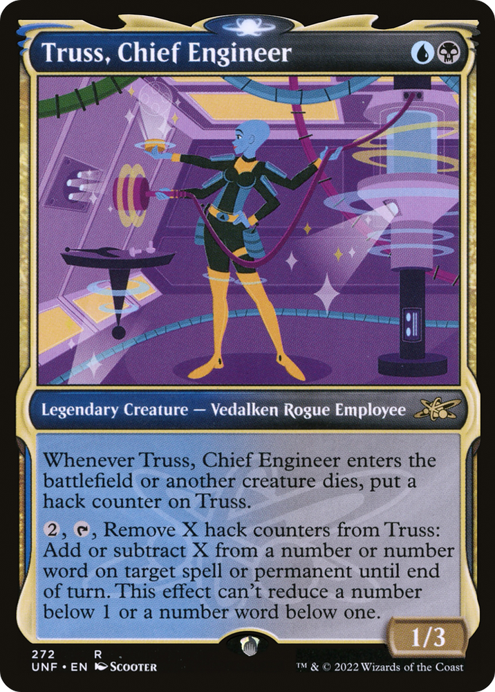 Whenever Truss, Chief Engineer enters or another creature dies, put a hack counter on Truss. , , Remove X hack counters from Truss: Add or subtract X from a number or number word on target spell or permanent until end of turn. This effect can't reduce a number below 1 or a number word below one.