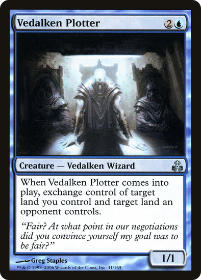 When this creature enters, exchange control of target land you control and target land an opponent controls.