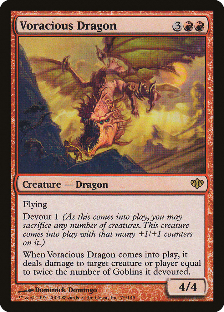 Flying Devour 1 (As this creature enters, you may sacrifice any number of creatures. It enters with that many +1/+1 counters on it.) When this creature enters, it deals damage to any target equal to twice the number of Goblins it devoured.