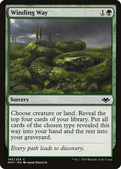 Choose creature or land. Reveal the top four cards of your library. Put all cards of the chosen type revealed this way into your hand and the rest into your graveyard.