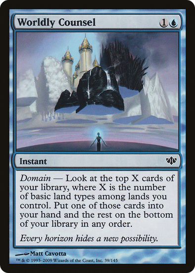 Domain — Look at the top X cards of your library, where X is the number of basic land types among lands you control. Put one of those cards into your hand and the rest on the bottom of your library in any order.